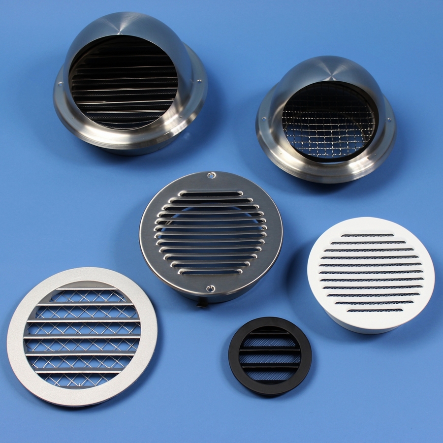 Einstellbar, für Zu- und Abluft, aus geschliffenem Edelstahl. Ansprechendes Design. Rundes Modell mit Ansschlußstutzen mit Klemmfeder aus Stahl.