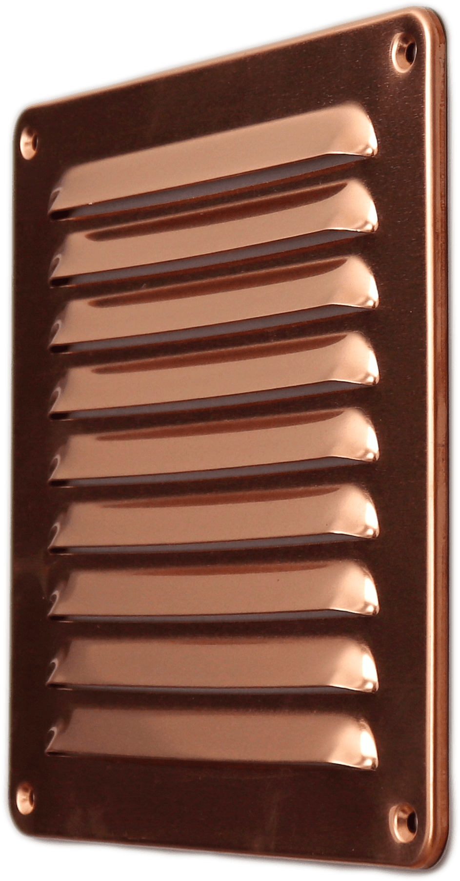 Schoepenrooster met omgezette rand, vervaardigd van rood koper. Op dit rooster vormt zich onder invloed van de buitenlucht na enige tijd een fraaie beschermende patina laag van donkerbruine of groene kleur, die een zeer lange levensduur garandeert.