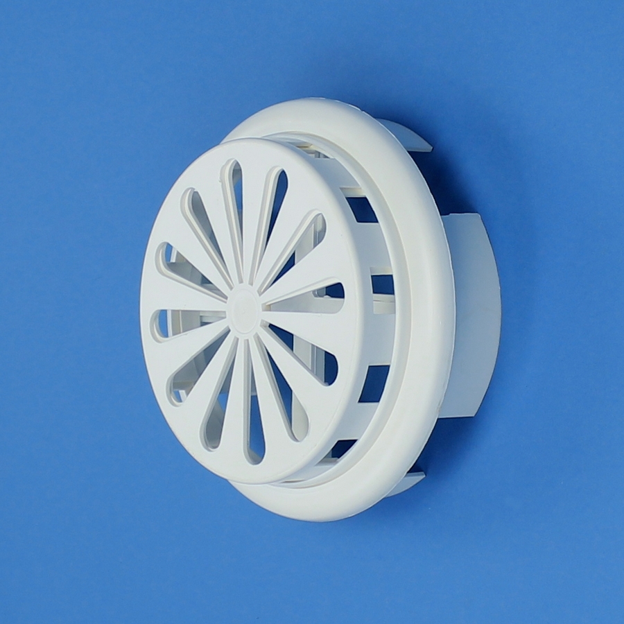 Ventilatierooster vervaardigd van kunststof, geschikt voor montage in buis. Afsluitbaar.