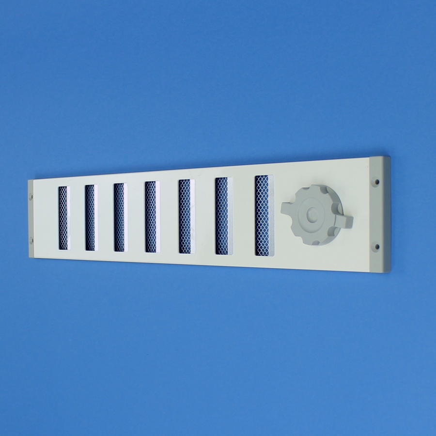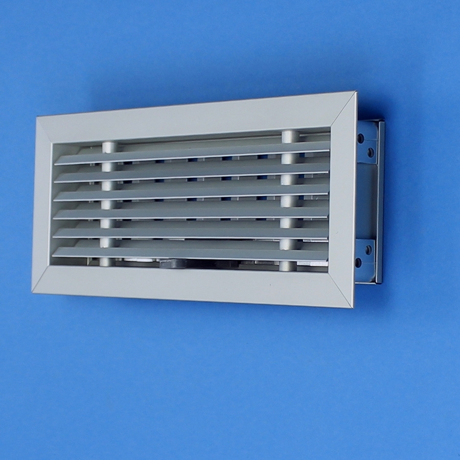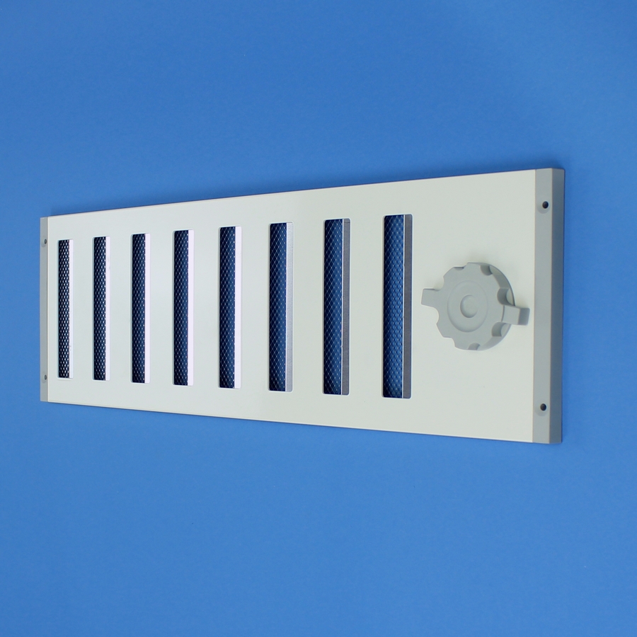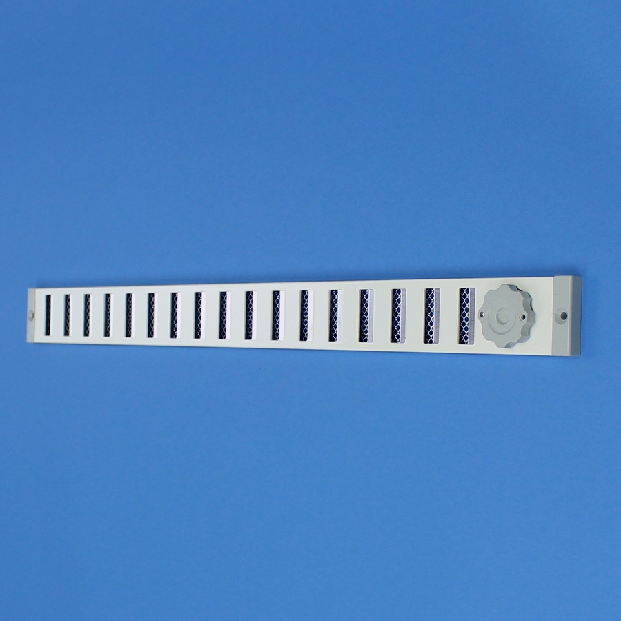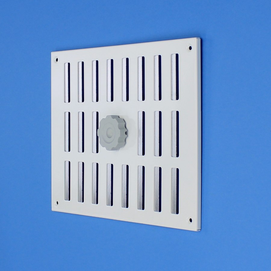 Afsluitbaar rooster vervaardigd van aluminium, opbouw. Rooster is voorzien van een draaiknop, geschikt voor een eventuele koordbediening.