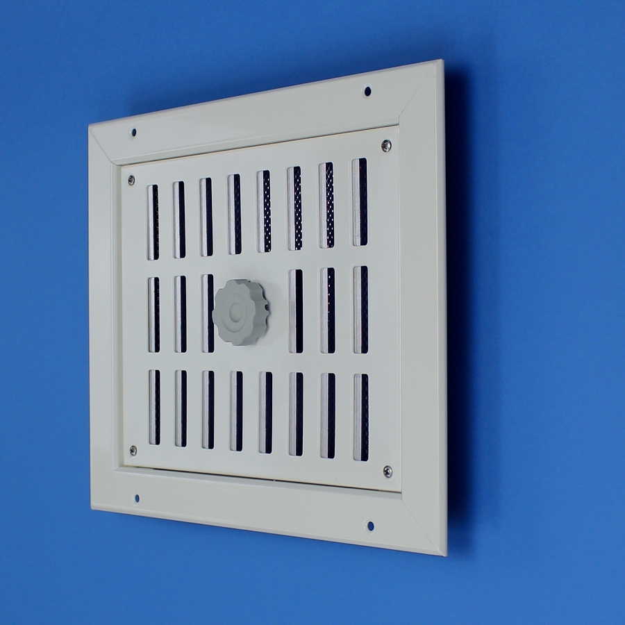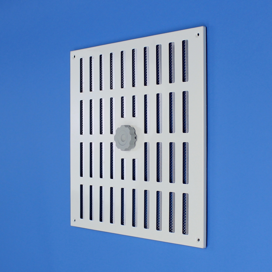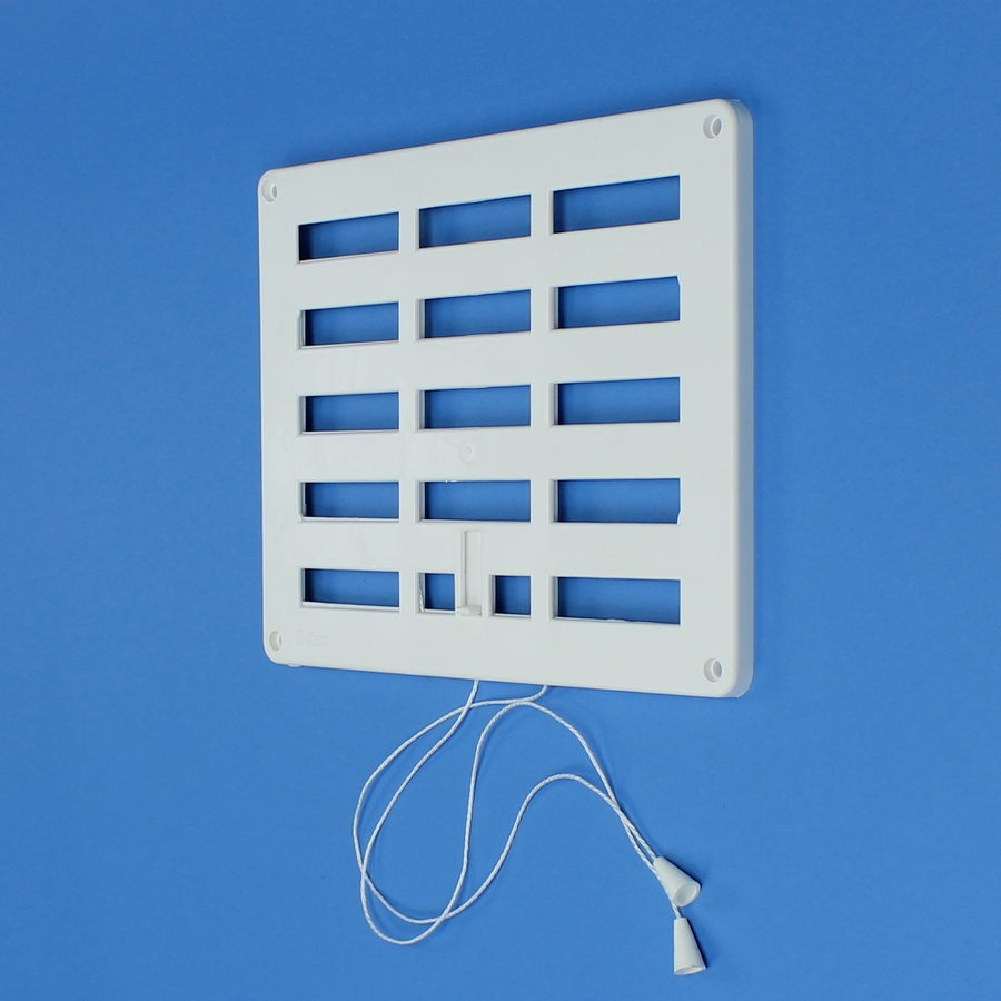 Afsluitbaar rooster vervaardigd van aluminium, inbouw. Rooster is voorzien van een draaiknop, geschikt voor een eventuele koordbediening.