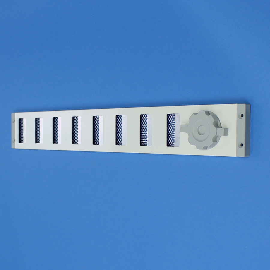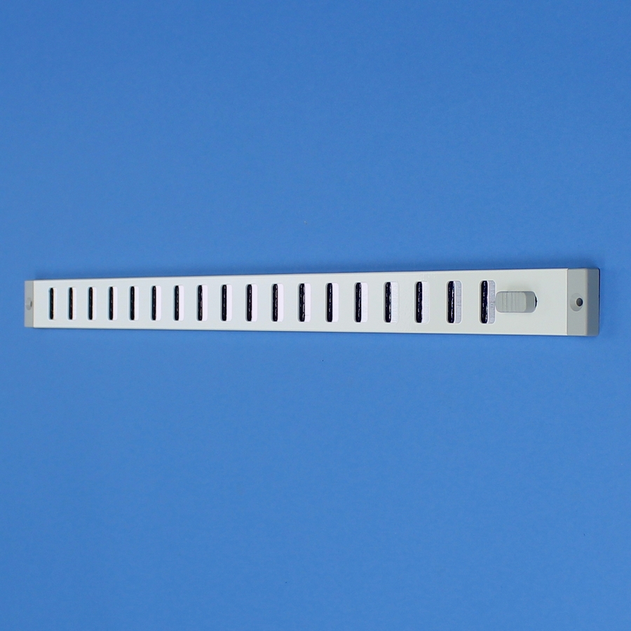 Schuifrooster vervaardigd van aluminium, opbouw. Dit rooster is samengesteld uit meerdere schuifroosters. Door een gemonteerd kader en tussenstrippen is deze gefabriceerd tot één rooster en bevat dus meerdere draaiknoppen.