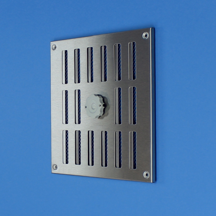 Afsluitbaar rooster vervaardigd van RVS, opbouw. Rooster is voorzien van een draaiknop, geschikt voor een eventuele koordbediening..