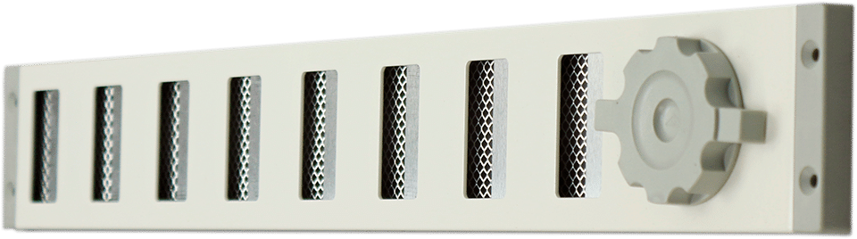 Afsluitbaar rooster vervaardigd van aluminium, opbouw, 65 mm hoog. Rooster is voorzien van een draaiknop, geschikt voor een eventuele koordbediening.