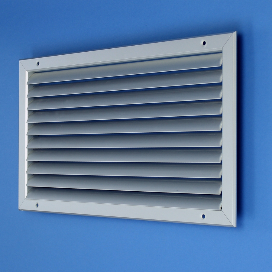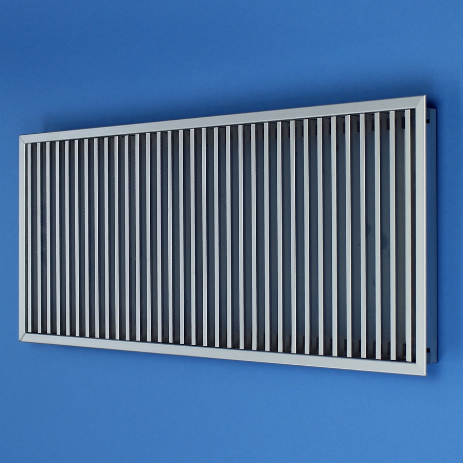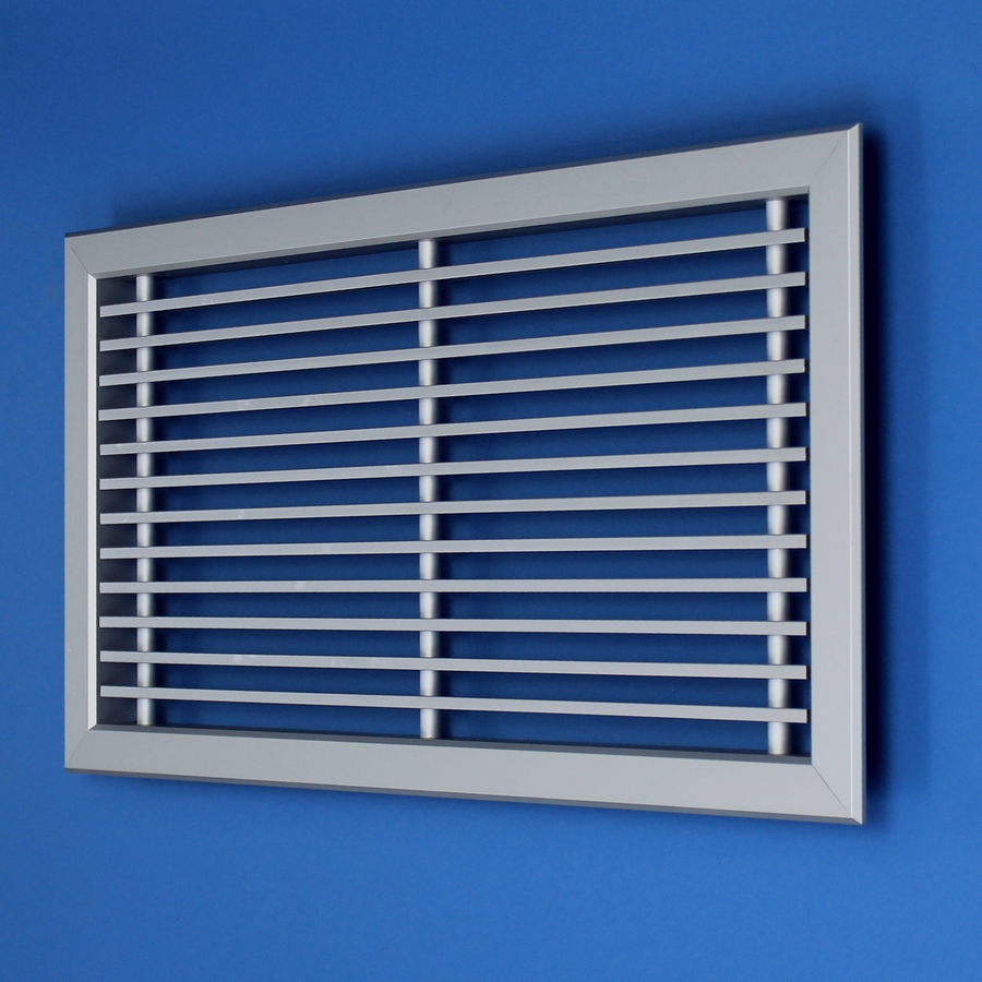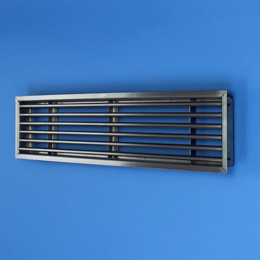 Toevoerrooster vervaardigd van aluminium extrusieprofielen. Voorzien van afzonderlijk instelbare lamellen met een gebogen vorm.
